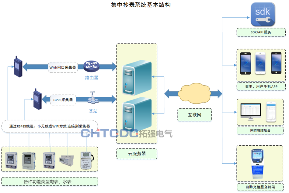 本系統(tǒng)由水電表,云服務(wù)器,數(shù)據(jù)采集器,手機(jī)APP,網(wǎng)頁后臺,自助充值終端等組成