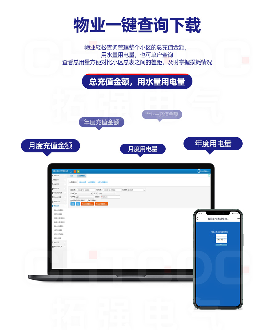 電表可與本公司遠程抄表系統和手機APP配套使用,遠程抄表管理系統具有實時抄表、定時抄表外,還提供了設備管理功能,如告警、余額短信通知、遠程充值、手機抄表、手機查詢、手機充值、預付費、后付費、自助充值機充值、遠程拉合閘、各種查詢報表、統計報表下載等功能。